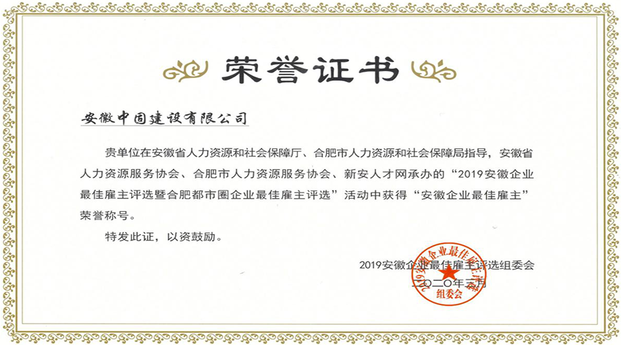 近日,由安徽省人力資源和社會保障廳、合肥市人力資源和社會保障局指導,安徽省人力資源服務協會、合肥市人力資源服務協會、新安人才網承辦的“2019安徽企業最佳雇主評選暨合肥都市圈企業最佳雇主評選”活動中,安徽中固建設有限公司榮獲“安徽企業最佳雇主榮譽稱號。