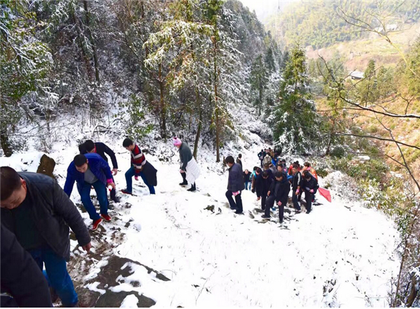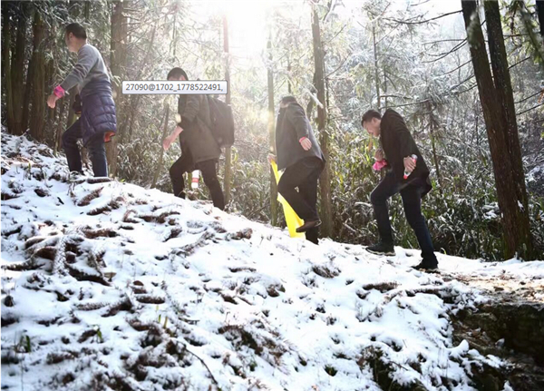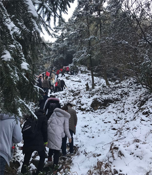 “靈山九華,美在花臺”,雪花更是為花臺增添了幾分誘人的仙氣,四支隊伍三百余人浩浩蕩蕩出發,平坦處,小伙伴們還打起了雪戰。出發后半小時左右,山路開始陡峭起來,厚厚的積雪給隊伍帶來了很大的阻礙,我們也真真應了魯迅先生那句“世上本沒有路,走的人多了也便成了路”。隨著海拔的升高,呼吸越來越急促,腳步也沉重起來。地面出現了大片積雪,路越來越不好走,大家小心謹慎的一步步向前。這時,沒有聲音沒有命令,男生自覺地開始幫助起了女生,穿專業登山服的人開始走在了前面,遇到路滑的地方他們自動清理,遇到陡坡,他們主動站在旁邊幫著拉一把、推一把或是小心攙扶。走在前面的人遇到路滑的地面會第一時間提醒身后的人,甚至在旁邊留字提醒……