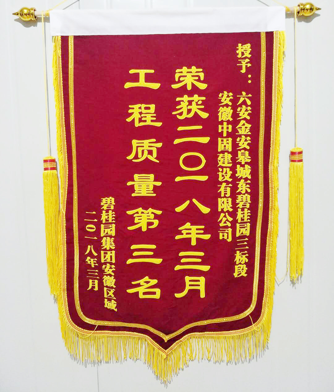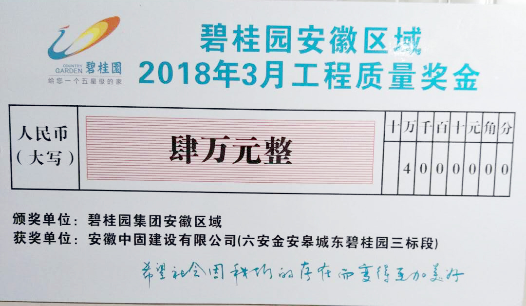 2018年4月9日,中固建設六安金安皋城東碧桂園三標段項目部發來捷報,公司榮獲“碧桂園集團安徽區域六安金安皋城東碧桂園三標段工程質量第三名”,并獲得4萬元獎金嘉獎。據悉,該項目連續五個月來在碧桂園集團區域檢查中均排在前列,更為難得的是取得了2017年度工程質量一等獎的好成績。