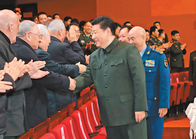 下午4時許,習近平來到老同志中間,全場響起熱烈掌聲。習近平同大家親切握手,關切詢問他們的身體和生活情況,共同回顧黨的十八大以來黨、國家、軍隊事業取得的歷史性成就、發生的歷史性變革。老同志們很振奮,一致表示要更加緊密地團結在以習近平同志為核心的黨中央周圍,全面深入貫徹黨的十九大精神,以習近平新時代中國特色社會主義思想為指導,貫徹習近平強軍思想,牢固樹立“四個意識”,自覺堅定“三個維護”,滿懷信心迎接強國強軍新時代。