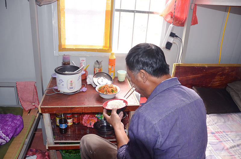 中午12點(diǎn),張師傅下班做好飯,開(kāi)始享受午餐。張師傅告訴筆者:“每天都是前一天晚上買好菜第二天下班后做飯,自己做著吃干凈、營(yíng)養(yǎng)”。雖然只有一個(gè)菜,但是他卻十分享受。
